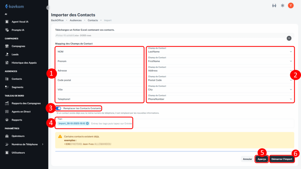 Importez un fichier .xlsx ou .csv depuis Audiences > Contacts > Importer. Faites correspondre les colonnes du fichier avec les champs de la base de données, gérez les doublons si besoin, puis cliquez sur « Démarrer l’import ». Les tags peuvent être ajoutés à tous les contacts importés pour faciliter leur utilisation en campagne.