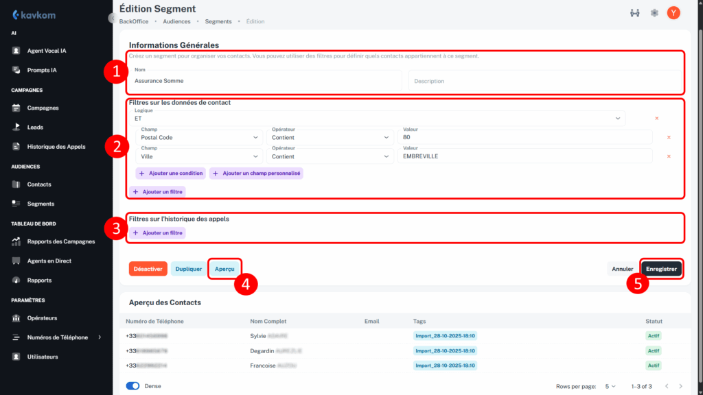 Les segments servent à regrouper automatiquement les contacts selon des critères définis et peuvent être utilisés dans les campagnes d’appels ou comme filtres dans la liste.