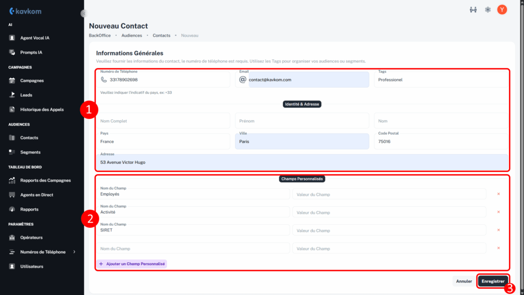 Renseignez les champs disponibles (1) et ajoutez si besoin des champs personnalisés via « Ajouter un champ personnalisé » (2) . Les tags sont essentiels pour identifier les contacts à inclure dans une campagne. Cliquez sur « Enregistrer » pour valider (3).