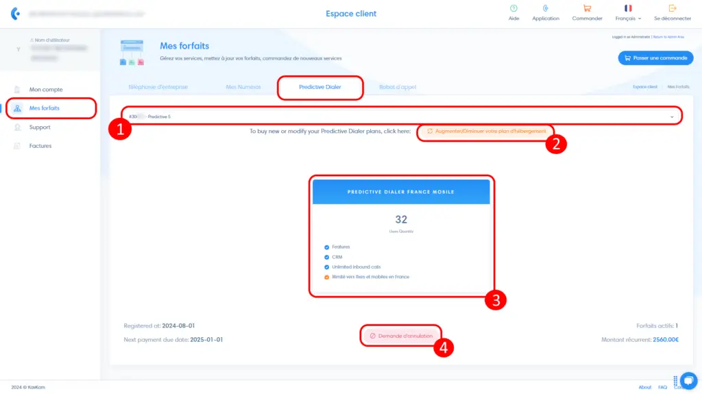 Dans cette interface, vous pouvez retrouver vos abonnements pour les services de « Téléphonie d’entreprise », « Mes numéros », « Predictive Dialer » et « Robot d’appel » (3).