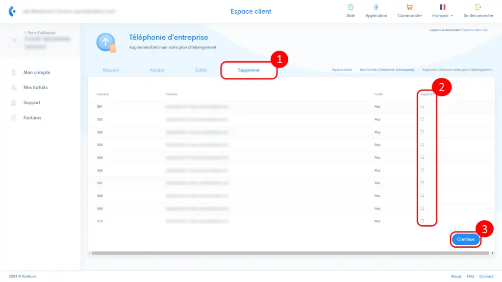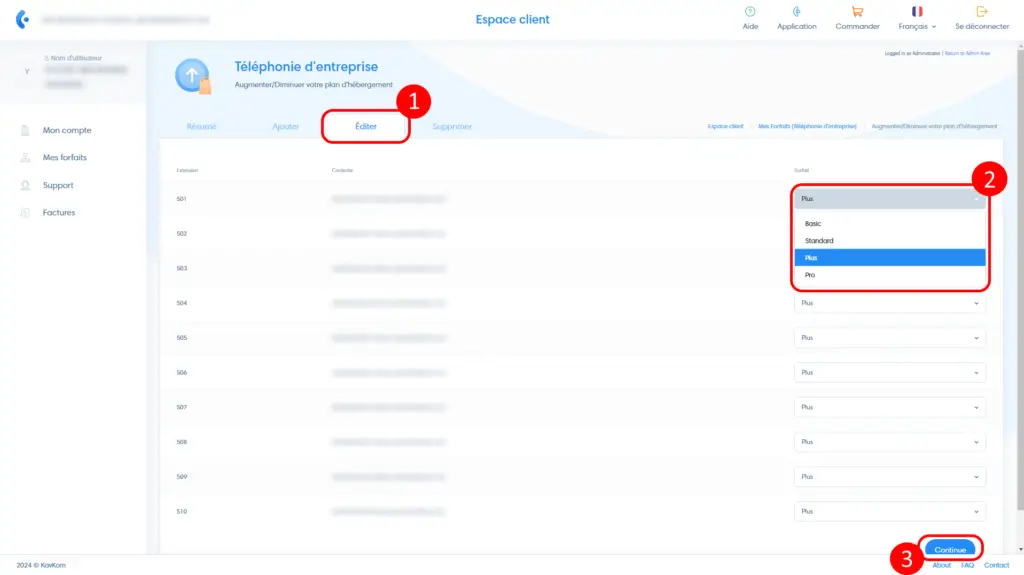 3. Cliquez sur « continuer ». Si vous passez à un forfait inférieur, une facture d’un montant à 0 est générée. Si vous passez à un forfait supérieur, effectuez le règlement de la différence pour activer la modification.