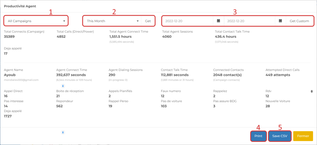 Avec cette fonctionnalité, vous pouvez consulter le nombre de session, le temps de connexion d’un agent, le nombre de contact connectés, le temps de conversation, le nombre d’appels ddirects, ainsi que les qualifications effectuées.