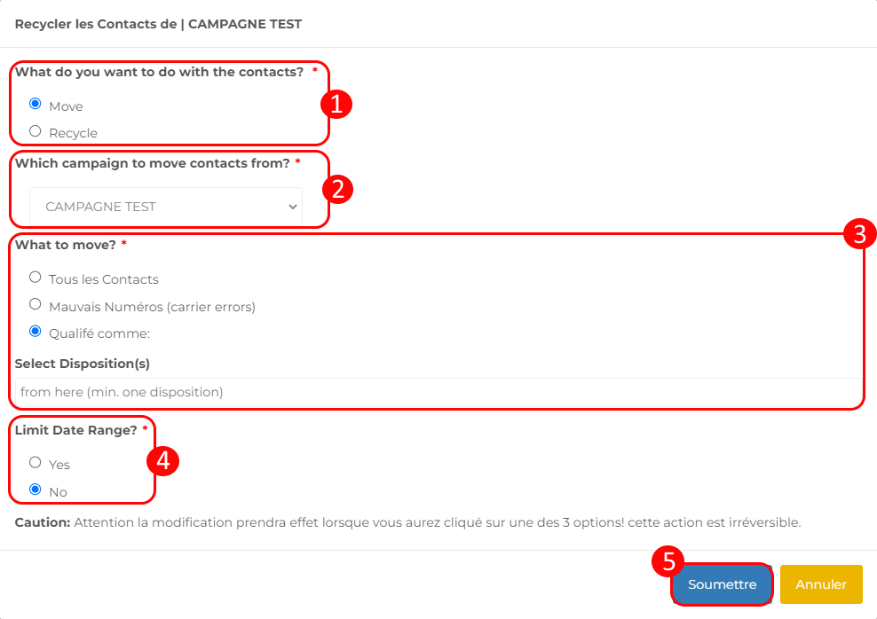 – Move : déplacer les contacts depuis autre campagne en les recyclant