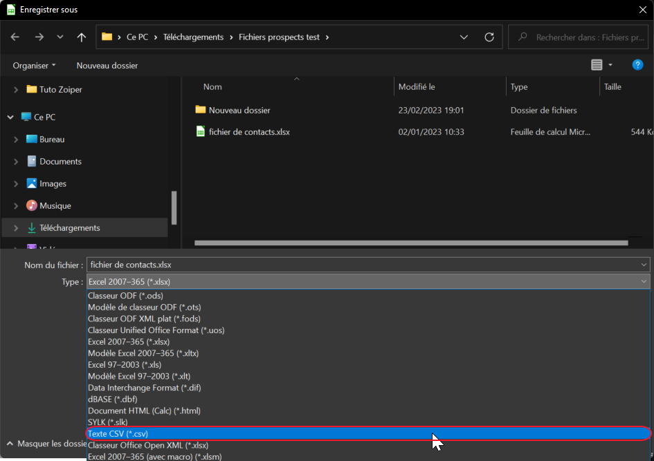 Dans le type, selectionnez « Texte CSV » puis cliquer sur « Enregistrer » en bas à droite.