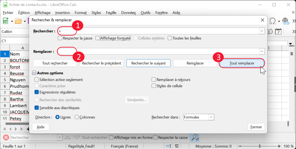 Dans le champ « Rechercher », tapez un « + » (1) et dans le champ « Remplacer » ne mettez rien, cliquez sur le bouton « Tout remplacer » (3) puis fermez la fenêtre.