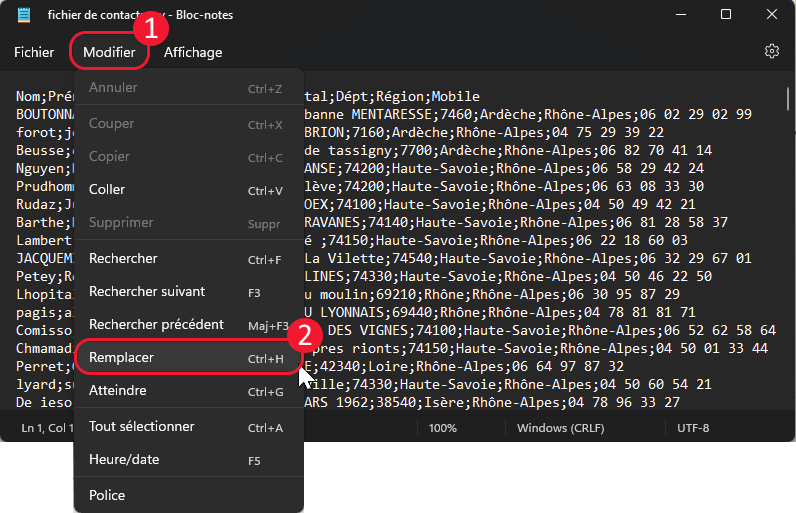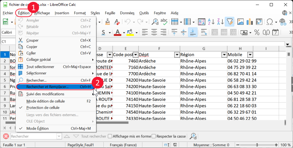Le format des numéros importés dans Kavkom devant comporter l’indicatif pays sans le +, si ceux de votre fichier commencent par un +, supprimez les en ouvrant le menu « Edition » (1) puis « Rechercher et remplacer » (2).