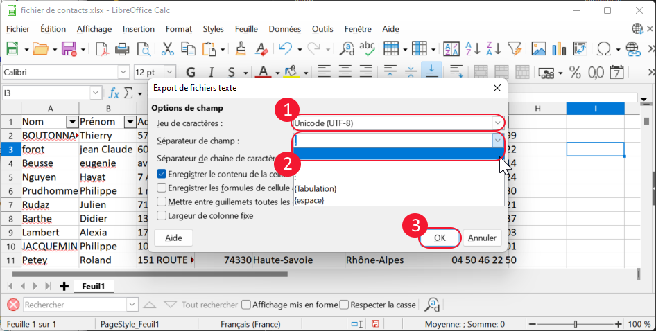 Dans la fenêtre « Export de fichiers texte », pour le jeu de caractère selectionnez « Unicode (UTF-8) » (1) et pour Séparateur de champ selectionnez la virgule (2) puis cliquez sur « OK » (3).