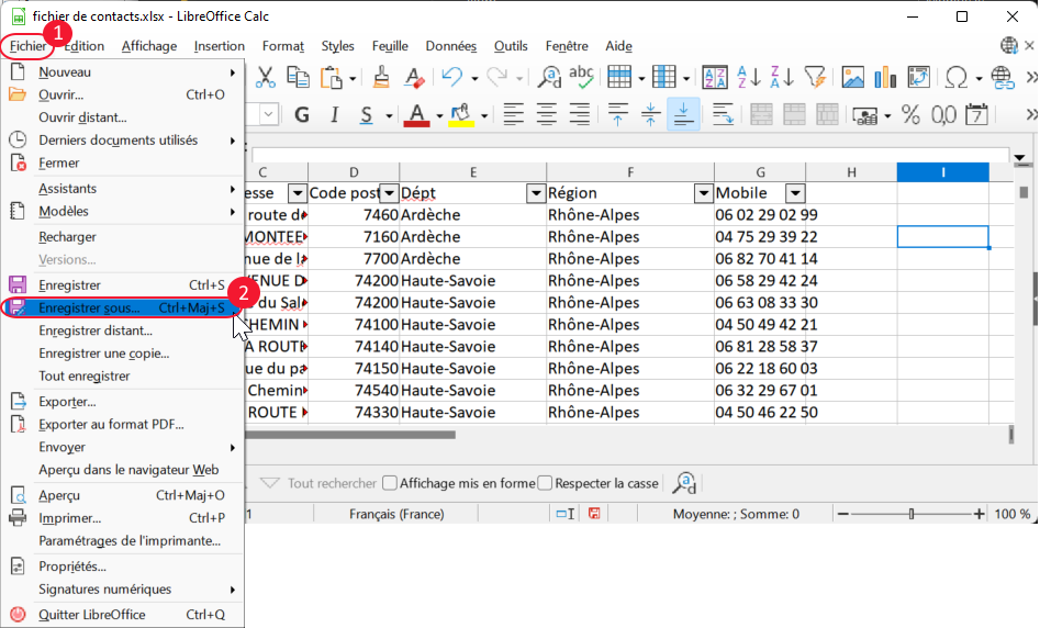 Ouvrez le menu « Fichier » (1) et cliquez sur « Enregistrer sous ».