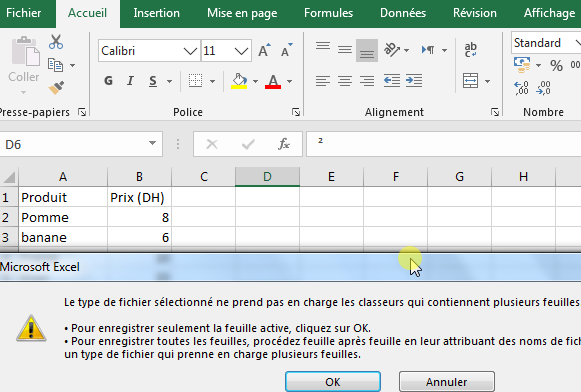 Lorsque vous cliquez sur « Enregistrer », Excel affichera la boîte de dialogue illustré dans la capture ci-dessous. Ne vous inquiétez pas, il ne s’agit pas d’un message d’erreur. En fait, lorsque vous enregistrez un classeur Excel au format CSV, il n’enregistrera que la feuille de calcul actuellement actif. Nous distinguons ici entre deux cas.