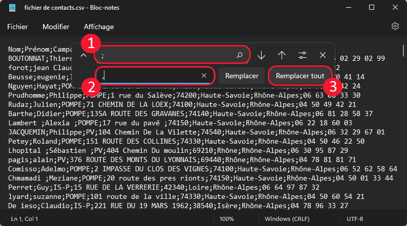 Dans le champ « rechercher » taper un point-virgule (1), dans le champ « remplacer par » taper une virgule (2) et cliquer sur « Remplacer tout » (3).