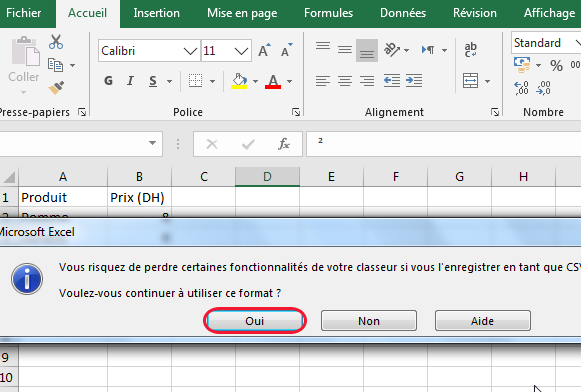 Lorsque vous cliquez sur « OK » dans la première boîte de dialogue, une deuxième boite de dialogue (illustré dans la capture ci-dessous) s’ouvre vous informant que votre feuille de calcul peut contenir des fonctionnalités non prises en charge par le codage CSV. Cliquez simplement sur « Oui ».