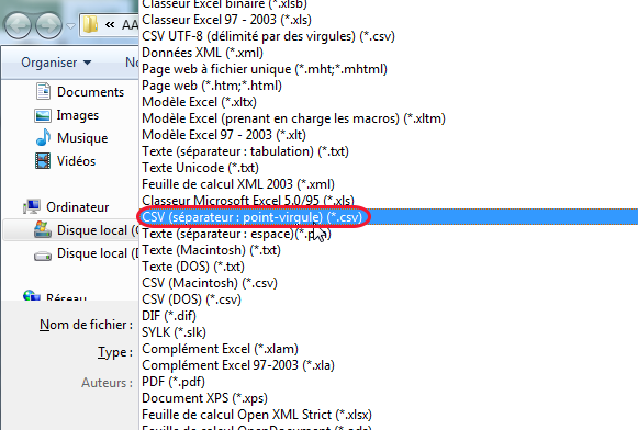 Dans la liste déroulante « Type de fichier », choisissez d’enregistrer votre fichier Excel au format « CSV (séparateur : point-virgule) (*.csv) » comme indiqué dans la capture ci-dessous. Ce format de fichiers enregistre la feuille de calcul Excel sous forme de texte séparé par des points-virgules qui peut être utilisé dans un autre programme Windows ou une autre version du système d’exploitation Windows.