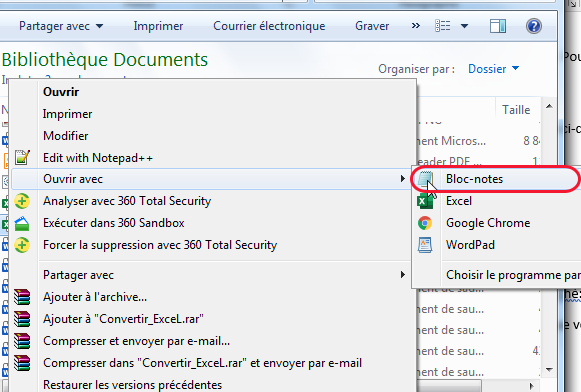 Maintenant, pour ouvrir le fichier CSV et voir son contenu, faites un clic droit dessus, sélectionnez « Ouvrir avec » dans le menu contextuel et puis choisissez « Bloc-notes » ou tout autre éditeur de texte préféré.