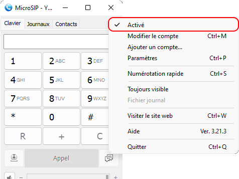 To deactivate an account in MicroSIP, access the menu and click on “Activate”.