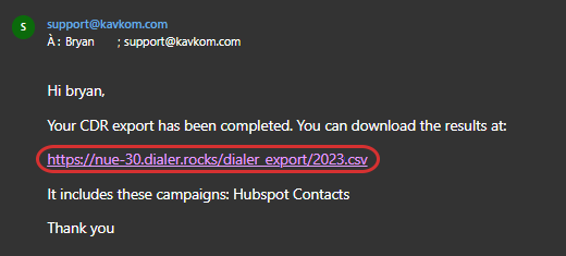 Once the file has been generated, you’ll receive an e-mail at the address indicated, with the sender’s address “support@kavkom.com”.
