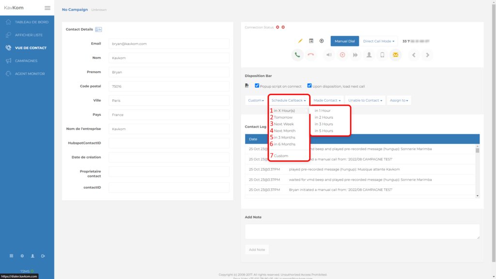 In the contact view, click on the “Schedule callback” button and on the desired callback type: