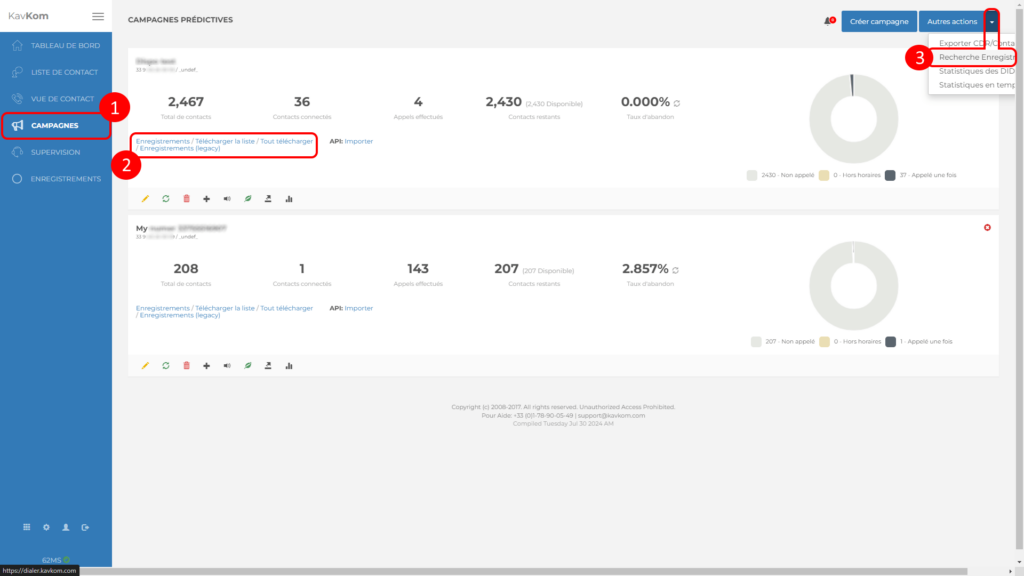 כדי לגשת להקלטות ממנהל הקמפיינים, לחצו על "קמפיינים" בתפריט משמאל (1). לאחר מכן עומדות בפניכם מספר אפשרויות:
