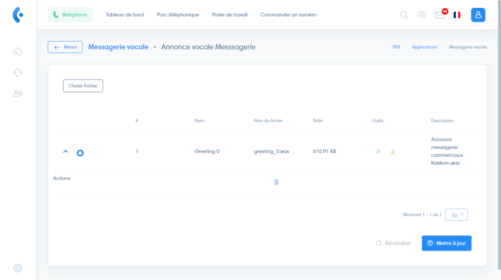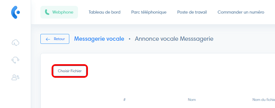 ניתן להקליט הודעה על ידי גישה לתא הקולי מהשלוחה המתאימה על ידי חיוג *97 ולאחר מכן קוד הגישה, או העלאת קובץ .wav מממשק זה. לשם כך, לחצו על כפתור "הודעה לתא קולי" המתאים לתא הקולי שברצונכם להתאים אישית, לאחר מכן על "בחר קובץ" כדי לבחור את הקובץ במחשב שלכם: