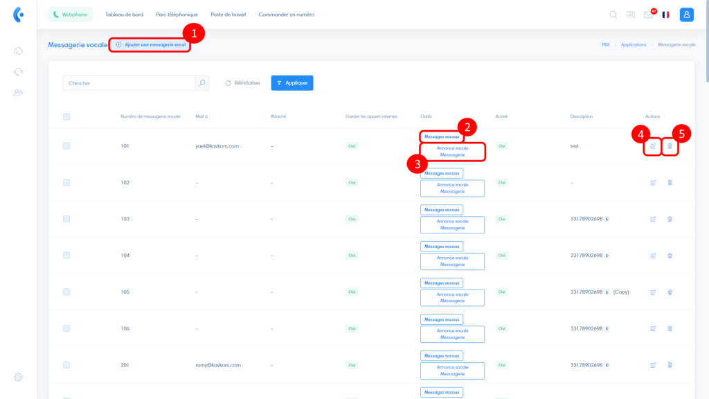 כדי ליצור הודעה קולית חדשה, לחצו על "הוספת הודעה קולית" (1) וכדי לשנות את ההגדרות של הודעה קולית קיימת לחצו על סמל העריכה בעמודה "פעולות" (4).