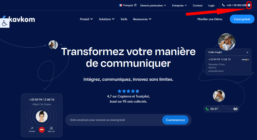 כדי להשתמש בו, עליך להיות מחובר לטלפון Kavkom או ל-WebPhone שלך, ולהפעיל טלפון IP או טלפון תוכנה. לחץ על הסמלים שליד מספרי הטלפון, ותקבל שיחה שתענה לה כדי להתחיל את השיחה.