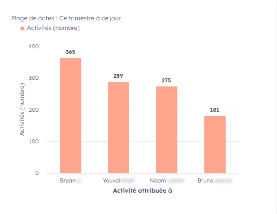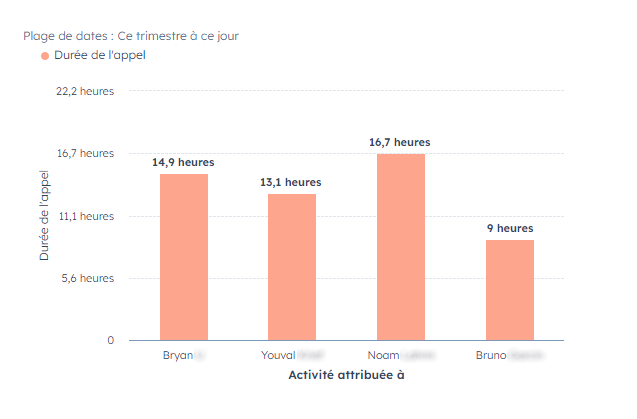 לחץ על התפריט הנפתח דיווח ← דוחות ← צור דוח ← אובייקט בודד ← פעילויות → הבא ← הוסף מאפיין פעילות → פעילות שהוקצתה ל- → הדמיה → לחץ וגרור את "פעילות שהוקצתה ל" ו"ספירת פעילויות" לקטע "תצוגה" → בחר את סוג התרשים המועדף עליך → לחץ על מסננים בפינה השמאלית העליונה → בחר את מסגרת הזמן לבחירתך → לחץ על הוסף מסנן → סוג פעילות → הוא אחד מ: התקשר → לחץ על "שמור", וזהו!