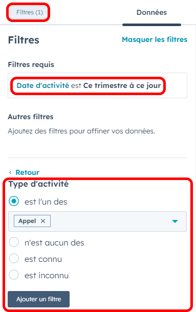 לחץ על "מסננים" בפינה השמאלית העליונה ובחר את התקופה לבחירתך בסעיף "תאריך פעילות". לאחר מכן, לחץ על "הוסף מסנן" ← "סוג פעילות" → "הוא אחד מ: התקשר", ולאחר מכן לחץ על "הוסף מסנן":