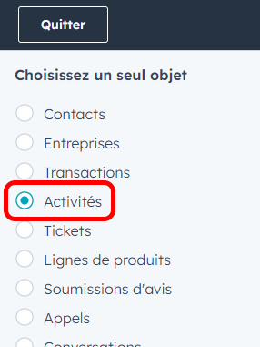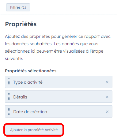 לחץ על התפריט הנפתח דיווח ← דוחות ← צור דוח ← אובייקט בודד ← פעילויות → הבא ← הוסף מאפיין פעילות (בקטע נתונים):