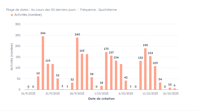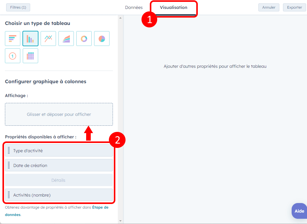 בלשונית "ויזואליזציה", בקטע "בחר סוג טבלה", בחר את התצוגה הרצויה ולאחר מכן בקטע "הגדר תרשים" גרור את "תאריך יצירה" (או כל מאפיין אחר) ואת "פעילויות (מספר )" מהקטע " מאפיינים זמינים" לקטע "תצוגה".