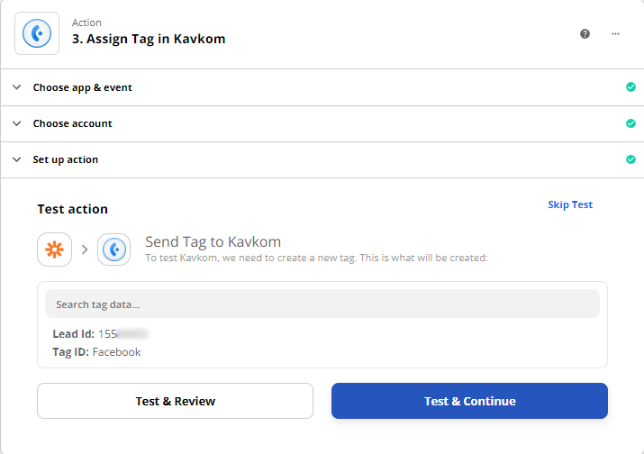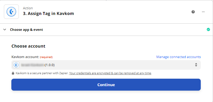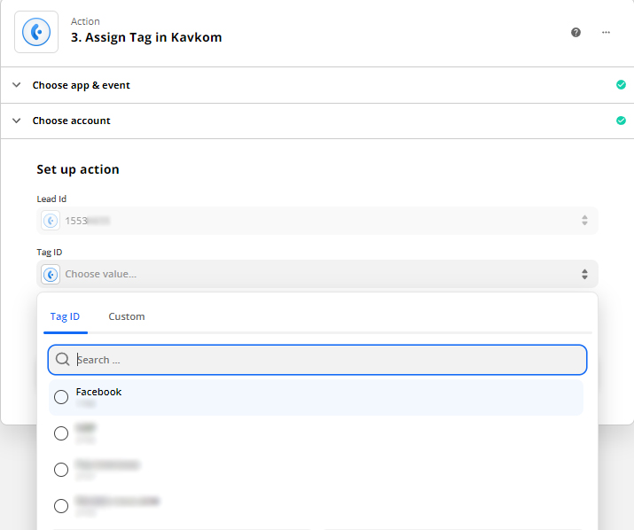 Une fois de plus, choisissez "Kavkom", mais cette fois cliquez sur "assign tag" dans l'événement d'action.