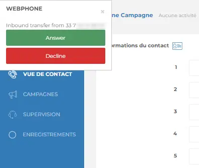 כאשר משתמש מקבל העברת שיחה או שיחה משולשת בחייגן, מופיע חלון קופץ עם מספר איש הקשר ומאפשר לך לקבל או לדחות את השיחה. אם השיחה מתקבלת, החיבור נוצר ופרטי איש הקשר מוצגים. אם השיחה נדחית או שהבקשה פגה, החיבור עם איש הקשר מנותק.