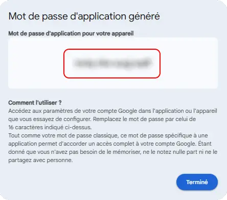 Copier le mot de passe généré et utilisez-le en tant que mot de passe pour le paramétrage SMTP Kavkom,