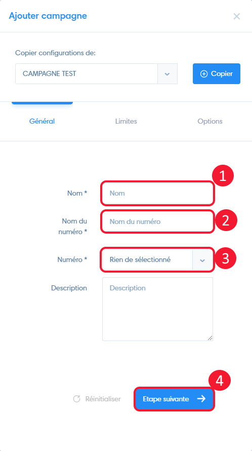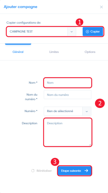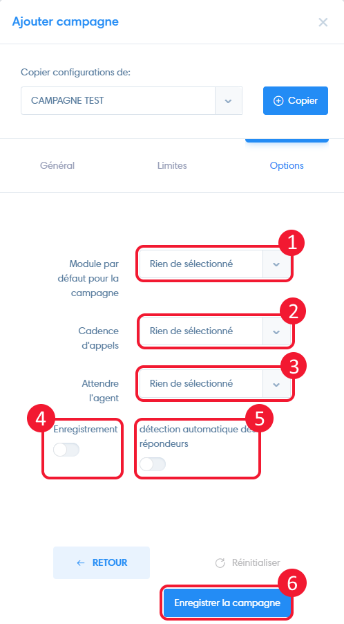 - Vous avez la possibilité de charger les réglages d’une campagne existante en la selectionnant et en cliquant sur « copier ».