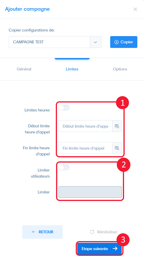- Limiter heures : Activez cette option pour limiter les appels à une certaine tranche horaire et en réglant le début et la fin de la limite d’appel.