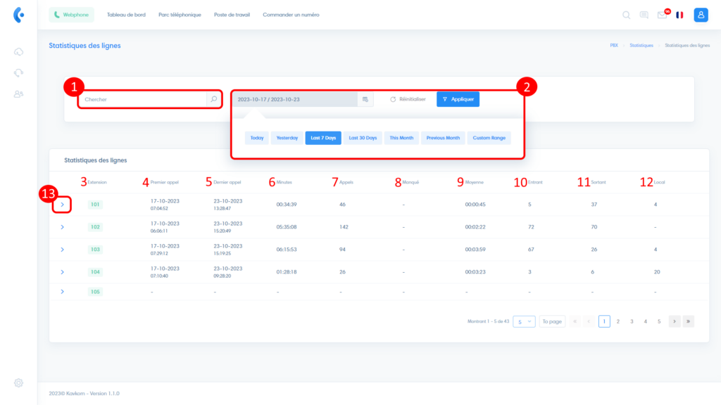 Le menu statistique des lignes permet de consulter les données d’utilisation des postes téléphoniques.